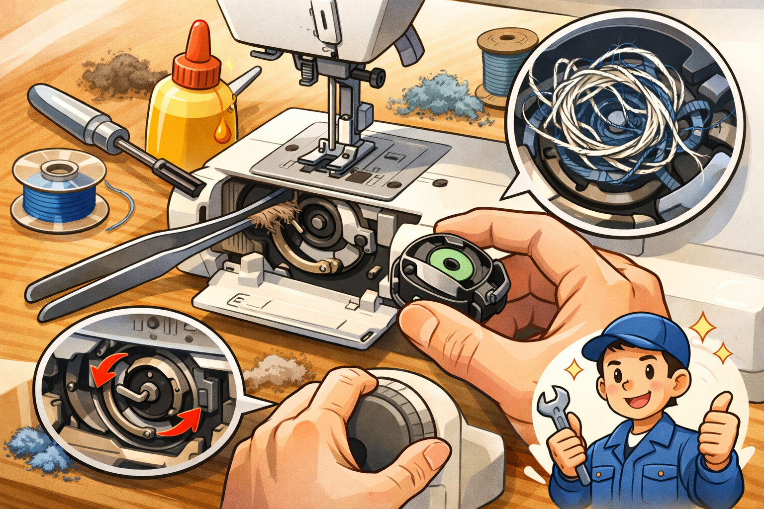 ボビンが回らない系のトラブルは、だいたい糸の通り道とセットの座りに原因があります。焦るほど沼るので、あなたのペースで一個ずつ確認していきましょう。