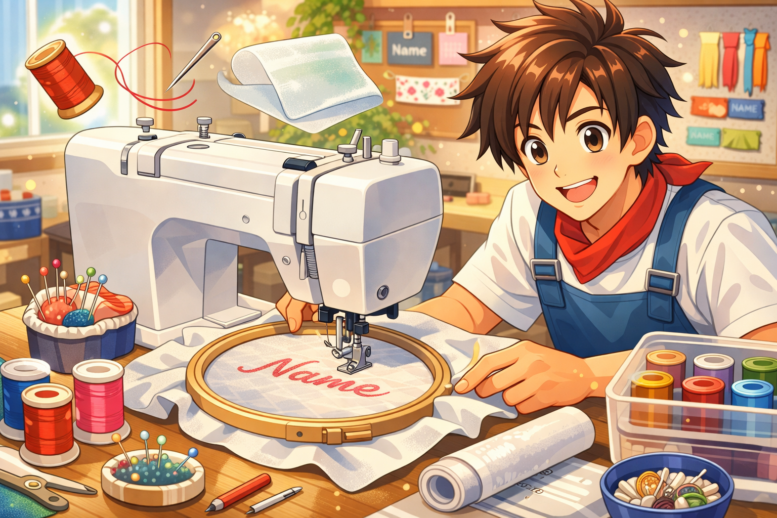 ミシンで名前刺繍するやり方が知りたいけれど、文字縫いでいいのか、フリーモーション刺繍のやり方が必要なのか、刺繍枠の張り方や位置合わせ、接着芯と水溶性シートの選び方、タオルへの名前刺繍のやり方まで気になることが多いですよね。さらに、文字入力とフォントの選び方、文字サイズ調整のポイント、糸調子と速度調整のコツ、針が折れる時の対処法まで考え出すと、最初の一歩が止まりがちです。