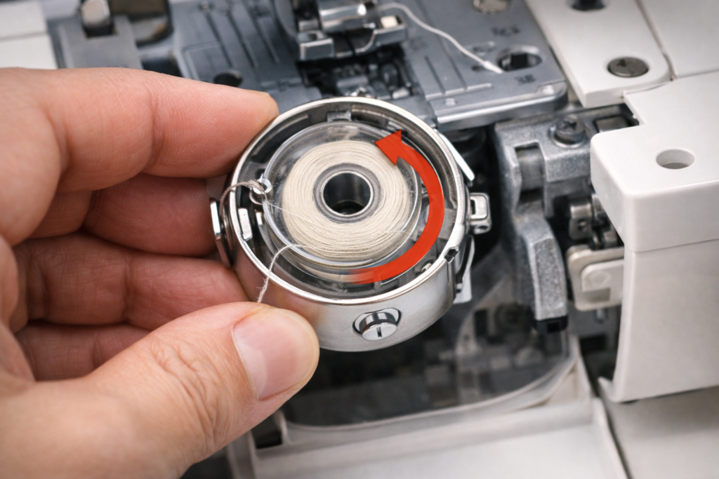 基本は、ボビンを入れたときに糸が反時計回りになる向きが多いです(機種差あり)。ただ、ここで重要なのは「回り方向」そのものより、糸が指定のガイド溝に入っているかです。ボビンをポンと置いただけだと、下糸が釜の中でふわふわしてしまい、上糸が掬う瞬間に逃げたり、変な位置で引っ掛かったりします。