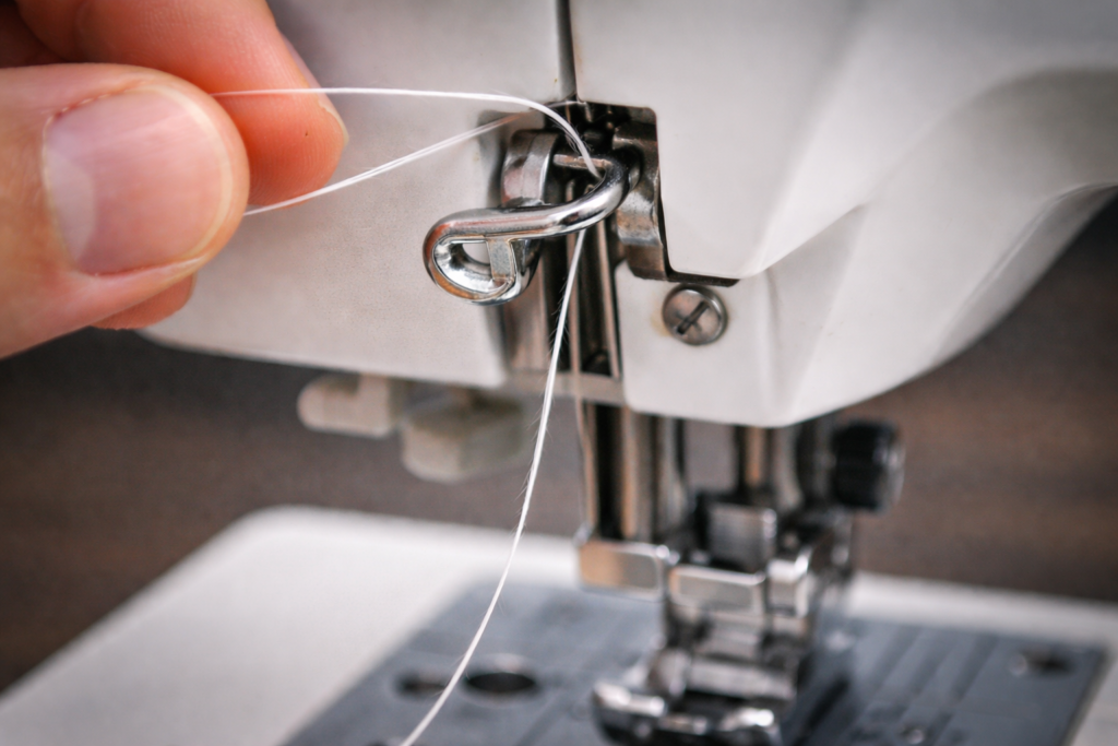下糸を拾う動きって、実は「下糸側」よりも上糸が正しいルートを通ってループを作れるかが支配しています。だから私は、下糸が上がらないときほど上糸を疑います。初心者ほど「糸は針穴に通ってるからOKでしょ」と思いがちなんですが、ミシンは針穴の前段階で“勝負が決まってる”ことが多いです。