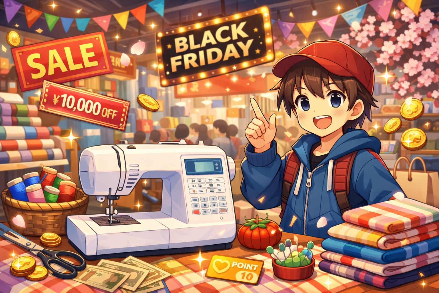 例えば、同じ本体価格でも、ポイント還元が増えたり、付属品セットが豪華になったり、クーポンが使える対象が広がったりします。初心者さんほど「安い時期=値札が一番下がる日」と思いがちなんですが、ミシンの場合は総額で見るのが大事です。糸・針・ボビン・押さえ・ミシン油・お手入れブラシ…スタートに必要な周辺が意外とありますからね。